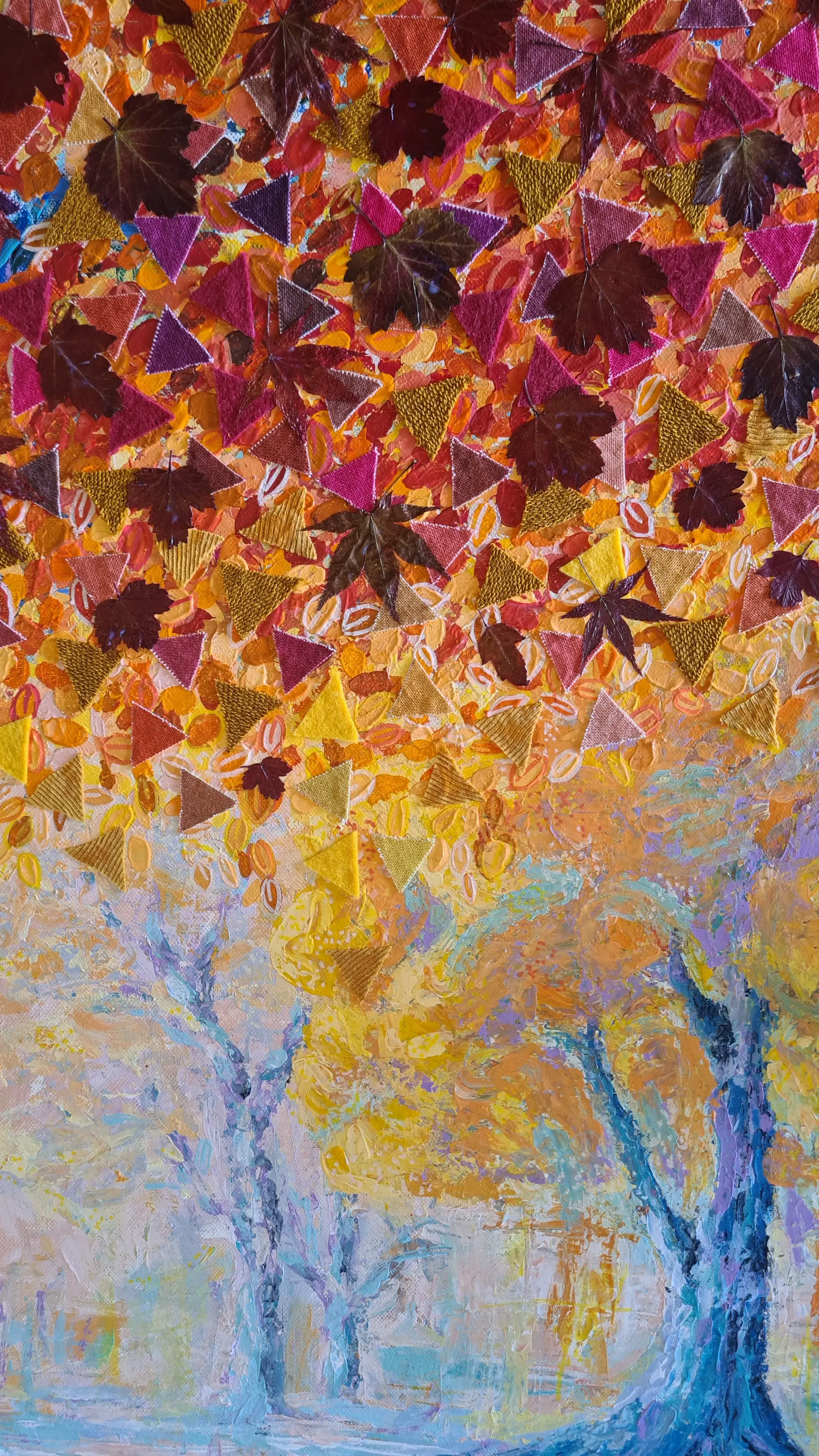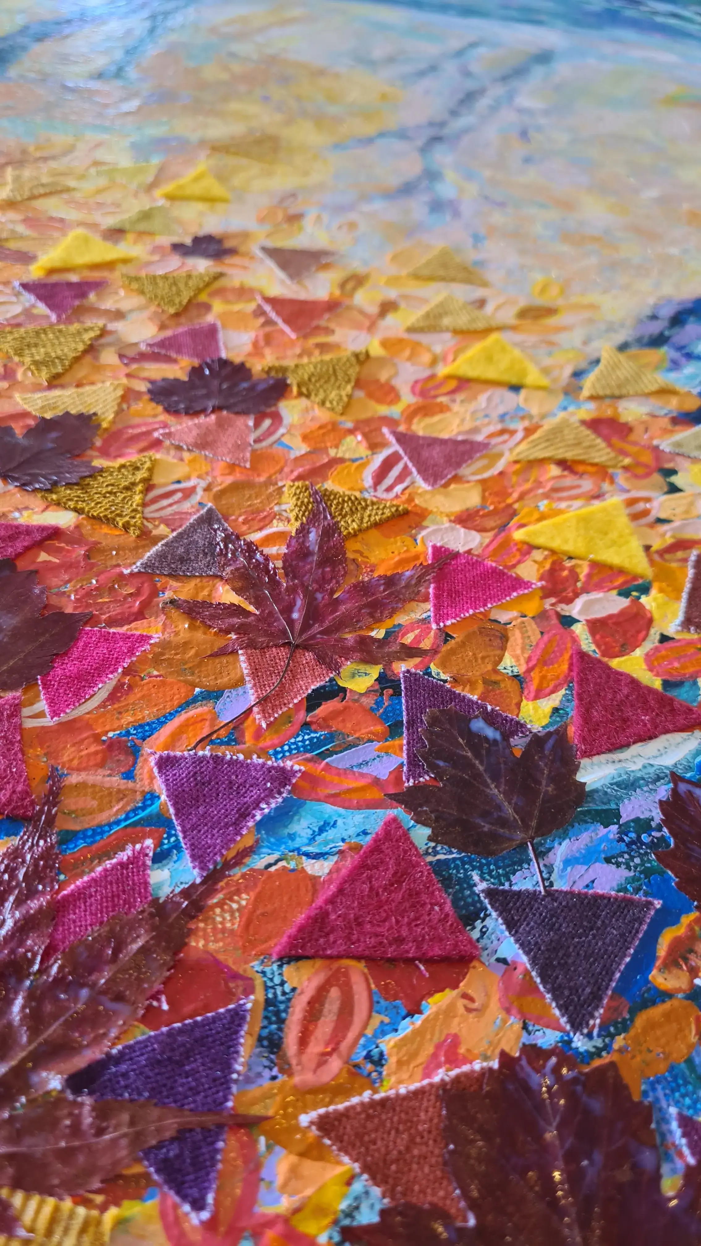 Collage, Acrylic, Marker, textile and dried natural elements.